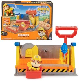Rubble & Crew - Werkstatt Spielset mit 2 Werkzeug-Aufsätzen, 1 Rubble Hundefigur, 85g Kinetic Sand Build-it Sand und 1 Sandform