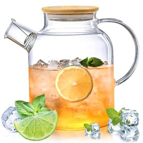 Teekanne Glas, Glaskaraffe mit Deckel aus Bambus, Klare Glasteekanne 1.8L, HitzebestäNdige ExplosionsgeschüTzte Borosilikatglas