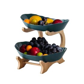 Xnqelerate Obstkorb Etagere, Keramik Obst Etagere mit 2 Etagen, Obstkorb Modern mit Bambus Steher, Abnehmbares Gemüsekorb Aufbe