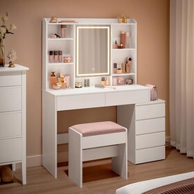 VASAGLE Schminktisch mit LED-Beleuchtung, Hocker, einstellbare Helligkeit, Frisiertisch mit Spiegel, Kosmetiktisch mit Schublad