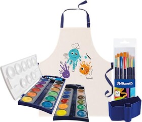 Pelikan 720631 Deckfarbkasten K24, 24 Qualitätsfarben und 1 Tube Deckweiß Malset I inkl. Baumwoll-Malschürze, 8 langlebigen Sy