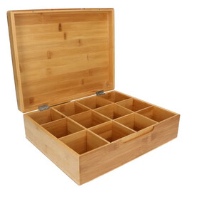 Schlichte, praktische Aufbewahrungsbox für Teebeutel. Sie können darin 12 verschiedene Teesorten aufbewahren und präsentieren. Der Griff ist als Vertiefung an der Vorderseite eingearbeitet und der Deckel hat einen Magnetverschluss.