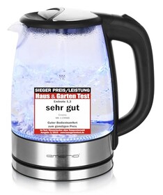 EMERIO Glas Wasserkocher mit 1.7 Liter Volumen | 2200 Watt | blaue LED Innenbeleuchtung | 360° Basis | SIEGER Preis/Leistung Ha