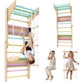 Sprossenwand Kinderzimmer Holz 7-in-1 Kletterwand – Indoor Klettergerüst mit Schaukel, Turnringen, Strickleiter, Kletterseil &
