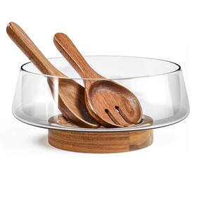 JTBDWOSK Extra großes Salatschüssel-Set aus Glas – Salatschüsseln für Party mit Akazienholzboden und Salat-Servierutensilien –