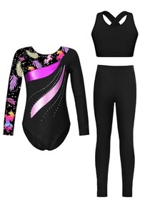 Miutii 3Pcs Mädchen Turnanzug Langarm Glitzer Gymnastikanzug Aufdruck Ballettanzug + Sport BH Tops + Hose Gymnastik Leotard Wet