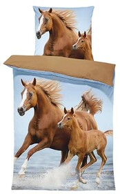 one-home Pferde Bettwäsche 135x200 cm Pferd im Wasser Fohlen blau braun Kinder Microfaser