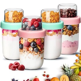 ComSaf 4er Overnight Oats Gläser, 480ml+120ml Müslibecher to go, Joghurtbecher mit Doppelschicht-Design, Trocken- und Nasstrenn