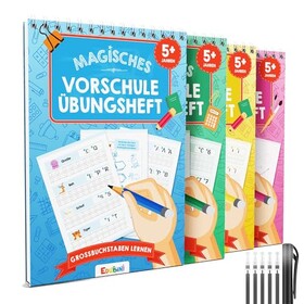 Edubini Magische Vorschule Übungshefte ab 5 Jahren für Junge & Mädchen - [4 Hefte + Stift] - Wiederverwendbare Schreiblernhefte