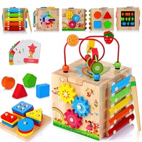 HELLOWOOD 8 in 1 Motorikwürfel ab 1 Jahr Aktivitätswürfel Stapel- und Sortierbrett Wort Karten Motorikspielzeug Baby Montessori