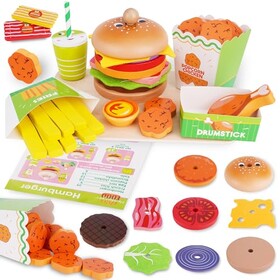 Kinderküche Zubehör Spielküche Spielzeug ab 3 Jahre, Holzspielzeug Fast Food Set Matschküche Zubehör mit Burger, Pommes, Drumst