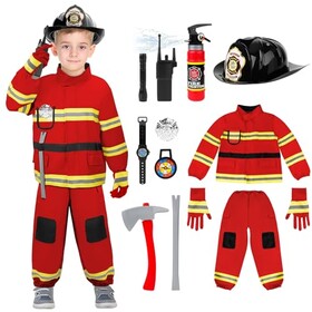deAO Feuerwehr Kostüm Set für Kinder, 12 Teiliges Feuerwehr Rollenspiel Set mit Feuerlöscher Jackenanzug Helm Walkie-Talkie, Fe