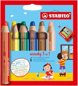 STABILO - Buntstift, Wasserfarbe & Wachsmalkreide - woody 3 in 1-6er Pack mit Spitzer - 6