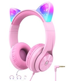 iClever Kinder Kopfhörer, Katzenohr-LED-Leuchte Over-Ear mit 85dBA Lautstärkebegrenzung Faltbare HD Stereo Kabel Kopfhörer, für