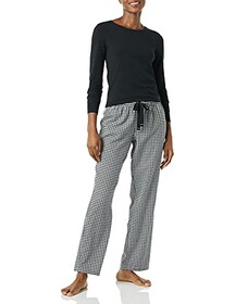 Amazon Essentials Damen Schlaf-Set leichte Flanellhose und langärmeliges-T-Shirt, Schwarz/Weiß, Vichy Karo, XXL