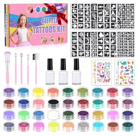 Glitzer Tattoo Set, Glitzertattoos Kinder Set für Mädchen - 36 Farben,220 Tattoos Schablonen Temporäre Kinder Inkl. 5 Pinsel &