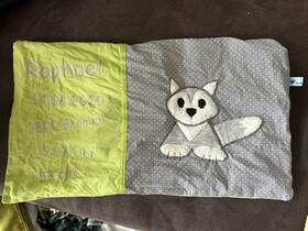 Ein Kissen in längs , personalisiert , so ähnlich wie Raphaels Kissen, nur mit Leonards Daten :D