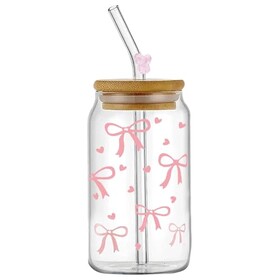 ESYFOR Glas mit Deckel und Strohhalm, 16 oz Glas Trinkbecher Aesthetic Bow Design Glasbecher Eleganter Trinkgläser Vielseitiges