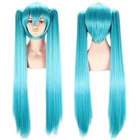 Lange Blaue Gerade Perücke mit 2 Pferdeschwänze Anime Party Vocaloid Hatsune Miku Cosplay Wig Clip auf 100cm/39in Synthetische