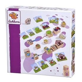 Eichhorn - Bauernhof Fädelspiel, bestehend aus 13 Holzteilen und 13 Pappvorlagen, aus 100 Prozent FSC zertifiziertem Buchenholz