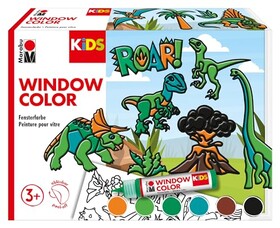 Marabu - KiDS Window Color Set Dinosaurier, 6 x 25 ml Fensterfarbe auf Wasserbasis, 2 Malvorlagen in A3 und A4, 30 Motive, für