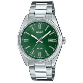 Casio Unisex Quartz Armbanduhr, 39.00mm Gehäusegröße mit grün analog Zifferblatt und Silber Metallarmband Armband MTP-1302PD-3