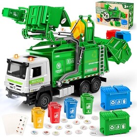 Charmofun Müllwagen Spielzeug, Müllauto Spielzeug mit 6 Mülleimer, 180 Müllkarten, Licht und Sounds, Müllabfuhr Auto Kinder Ges