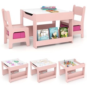 COSTWAY Kindertisch mit 2 Stühlen, 3 teilige Kindersitzgruppe aus Holz mit wendbarer Tischplatte, Bücherregalen & Aufbewahrungs