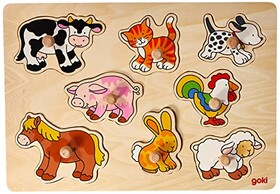 goki 57873 Steckpuzzle Bauernhof VII, 30 x 21 cm – Holzpuzzle mit 8 bunten Bauernhoftieren und großen Greifknöpfen