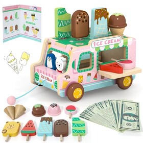 XIAPIA Holz EIS-Spielzeug für Kinder ab 1 2 3 Jahre Mädchen Junge, Kinder Eisdiele Eiswagen, Kinderküche Zubehör Eisladen Eistr