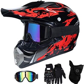 AMITD Motorradhelm Motocross Helm Kinder Rot Schwarz, Full Face Off-Road Motorrad Cross Helme mit Visier Brille Maske Handschuh