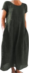 Sommerkleid Damen elegant Vintage Leinen Kleider Casual Rundhals Kurzarm Lang Bequeme Lockeres Baumwolle Leinen A Linie Maxikle