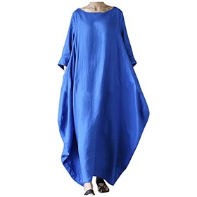 Wyongtao Lange Leinenkleid Damen Rundhals Lose Boho Kaftan Große Größen Halber Ärmel Mittelalter Baumwolle Leinen Maxikleid Ove