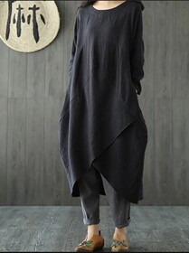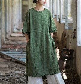 Buddha Stones Mittellanges Kleid Ramie Leinen Halbarm Top T-Shirt mit Schlitz am Saum