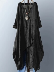 Stilvolles kariertes Vier-Jahreszeiten-Kleid in Übergröße, lässiger Rundhalsausschnit, markanter asymmetrischer Saum