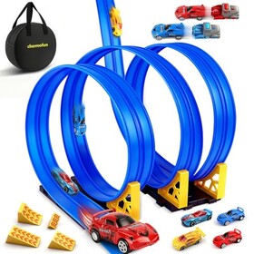 Charmofun Autorennbahn für Kinder 5M, Flexible Rennbahn Kinder mit 4 Autos, Aufbewahrungstasche, Katapult, Rennstrecke Auto Spi